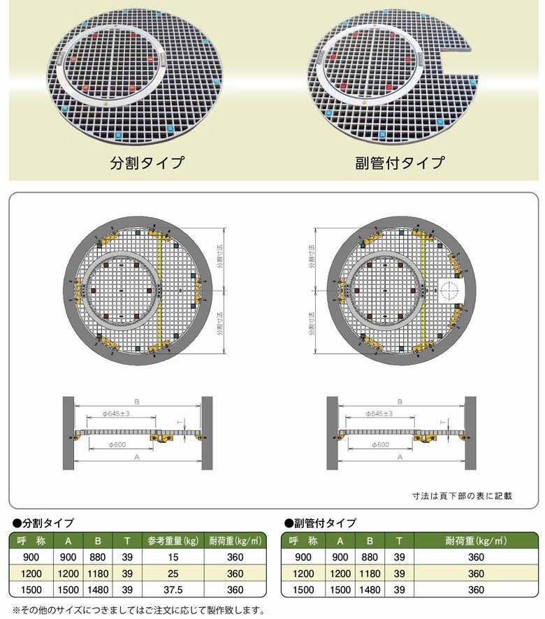 分割タイプは、φ600用・φ750用・φ900用と搬入口が狭い場合、分割して納めます。